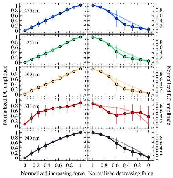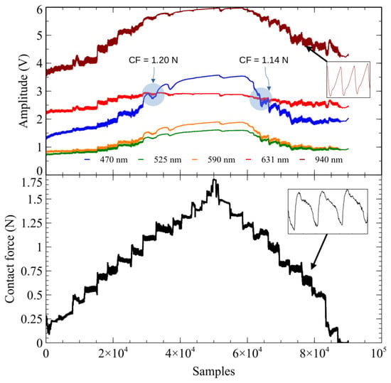 The apparent convergence of signal amplitudes for 631 nm and 470 nm, indicated by blue circles in Figure 2, is observed at CF values of 1.20 and 1.14 N, respectively. These convergence points were sporadically identified across datasets at low and high CF levels. In particular, convergence during the increasing phase of CF does not consistently correspond to convergence for the same signal amplitude during the decreasing phase of CF.