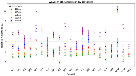 To contextualize the subsequently mentioned observations, the scatter plot shown in Figure 3 allows for examining the relative amplitude comparison among data records and wavelengths during CF variation. Upon further analysis of the raw data, we observe additional relative convergence among baseline levels of different wavelengths. In particular, the 631 nm wavelength intersects shorter ones. For example, in the SL9 record, convergence occurs between 631 nm and 590 nm, while in SL10 and SR11, it aligns with 525 nm. For the SR11 record, data from only one right finger could be recorded.