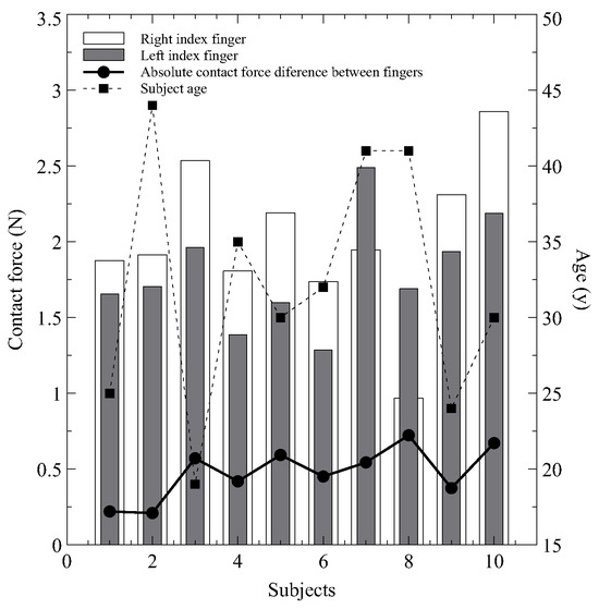 Furthermore, Figure 4 presents the maximum CF recorded on the fingertips of each subject, revealing expected biomechanical asymmetries between hands. It indicates that the CF on the right index finger is consistently higher than that on the left in 8 out of 10 subjects, with an average difference of 0.48 ± 0.17 N. This natural asymmetry is potentially due to biomechanical factors such as variations in the anatomical structure and biomechanics of the hands and fingers. However, the dominant hand of the subjects was not recorded during data acquisition. Future research should consider registering the dominant hand of participants.