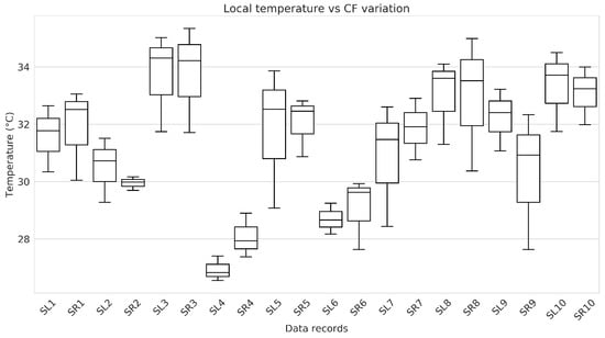 Box plots represent the distribution of local temperature variation per data record, spanning the entire range of CF variation. This range includes from the minimum to the maximum level of CF, followed by a decrease from this maximum point to the minimum level again.