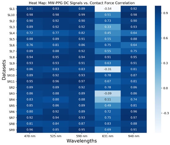 Heat map of Pearson correlation coefficients between DC components of the MW-PPG signal versus the CF.