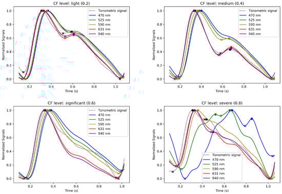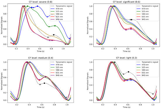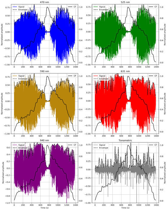 These figures showcase the effect of varying CF on the signal waveforms and illustrate the evolution of the pulse contours in these phases. MW-PPG AC pulses can be classified into two groups according to the depth of light penetration into the tissue: the deep penetration group (DPG) with long wavelengths (631 and 940 nm) and the superficial penetration group (SPG) with short wavelengths (470, 525, and 590 nm). This classification simplifies the analysis of morphological responses of signals.
