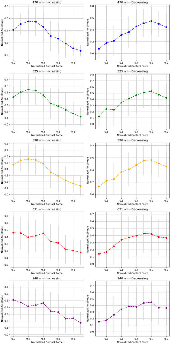 The right column of Figure 6 shows the values during the decreasing CF phase. In addition, the rising phase has been inversed and superimposed to facilitate comparison. This figure highlights the varying paths of different wavelengths through the rising and falling CF stages, revealing hysteresis in these patterns. The distinct behavior of the 631 nm wavelength is particularly emphasized in this visualization. Its amplitude initially decreases, reaching an inflection point at 0.6 of normalized CF, then increases to a second inflection point at 0.2 of normalized CF before decreasing again. This pattern of change contrasts with the more subtle slope variations observed for other wavelengths, further underscoring the unique response of the 631 nm wavelength to changes in CF. In general, hysteresis is an indicator of the ability of tissue and blood circulation to recover from compression. It varies significantly between individuals depending on tissue elasticity, vascular health, and the rate of blood reperfusion. Therefore, hysteresis analysis and comparison of waveforms at the beginning and end of CF decay could provide valuable information on tissue mechanical properties and vascular dynamics. In [28], similar observations are interpreted as evidence of the physiological self-protection mechanism, which increases blood flow in the cutaneous arteries in the face of the risk of occlusion.