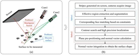 To achieve the batch measurement of specular planes and address the aforementioned challenges, the algorithm’s flow, as outlined in our manuscript, is depicted in Figure 1b. In the initial step, fringes of varying frequencies and periods are generated on the screen. The cameras perform image acquisition, and distortion correction is applied to the images. To ensure the stability of the measurement, the correspondence between camera pixels and screen pixels is established by using the four-step phase-shifting and multi-frequency (hierarchical) methods to achieve phase measurement and unwrapping [20]. Subsequently, in the second step, the effective region of the image is extracted based on the variation in fringes and segmented according to region connectivity. Moving on to the third step, corresponding surface matches are obtained based on the polar lines and normal vector constraints, thereby identifying the regions that correspond to the two cameras. In the fourth step, for each surface to be solved, the accuracy of contour extraction is further enhanced by searching within the vicinity of the polar lines. In the fifth step, the spatial position of the surface to be measured is determined based on the profile, and a plane pre-positioning method is employed to calculate the normal vector direction of the surface to be measured. Ultimately, in the final step, the shape of each plane to be measured is obtained via separate integration.