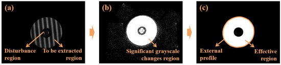 Effective-region and contour extraction using fringe contrast. (a) Specular fringe image of the surface to be measured. (b) Contrast calculation results (the higher the contrast, the larger the grayscale values). (c) Effective-region selection and contour extraction.