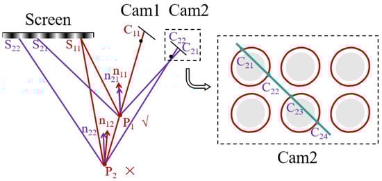 As shown in Figure 3, the polar line may have several intersection points (, , …) with respect to the extracted contour in camera 2. Since the surfaces of the specular reflection lack features and are similar, directly determining the corresponding points through features is difficult. Therefore, further determining the corresponding points through the difference in normal vectors of the intersection points is necessary. Taking and as an example, according to the principle of stereo vision, a corresponding pair of points on cameras 1 and 2 can determine a point in space, based on pixel coordinates and camera parameters. Thus, different points in camera 2 can determine a spatial corresponding point (, ) with the point selected in camera 1 (assumed to be ). After determining the spatial position of the point, its corresponding surface normal vector n11 can be calculated according to Equation (8). The parameter represents the vector from the light emitted by the screen to reflection point , and represents the direction vector of the light from the reflection point to the camera. The calculation method of is the same. Since the normal vector directions calculated in the left and right cameras for the same point on the object surface should be the same, the point with the smallest difference in the normal vector directions of the left and right cameras calculated via and is the corresponding point of the edge contour in the two cameras (as there will be deviations in the actual solution and the difference is not exactly equal to 0, the smallest difference is used as the basis for judgment). The same principle applies when judging multiple intersection points. Obviously, the area where the corresponding point is located is the corresponding area of the selected area in camera 1.