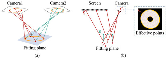 Furthermore, as illustrated in Figure 5a, the spatial location of the edge of the actual surface to be measured can be determined based on the corresponding points on the contours of the two camera images. Since the surfaces to be measured are planes, the least squares method can be applied to fit a plane to the spatially positioned contour. This plane serves as the position of the surface to be measured. Following the determination of the spatial plane for the surface, as shown in Figure 5b, any camera can be selected, and the intersection points of the corresponding rays from all pixels within its effective area with the fitted plane are computed. These intersections represent the spatial positions corresponding to the pixel points. Upon establishing the spatial position of the point, the directions of the incident and reflected light rays in space can be calculated based on the spatial positions of the corresponding camera pixel and screen pixel. Subsequently, the surface’s normal vector can be further computed for the entire surface to be measured.
