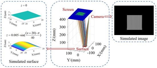 The simulation of the measurement system was implemented by using Matlab programming. The simulation model, illustrated in Figure 6, employs inverse simulation by tracing light rays backward from the camera pixels to the screen in order to generate fringe images captured by the simulated camera. It calculates the intersection point of each light ray with the known surface (provided as simulation input) and sequentially computes the surface’s normal vector and shape. The simulation involves a comparison of two algorithms for positioning the surface. These algorithms are referred to as Algorithm 1 (an approximation based on the results of the two-camera matching search) and Algorithm 2 (replacing the surface with a contour-fitting plane). The simulated surfaces for measurement include a flat surface and a sinusoidal surface with a 5 μm amplitude. Additionally, to simulate instances of inaccurate plane fitting, the contour-fitting plane is vertically shifted by 5 μm along the normal vector direction.