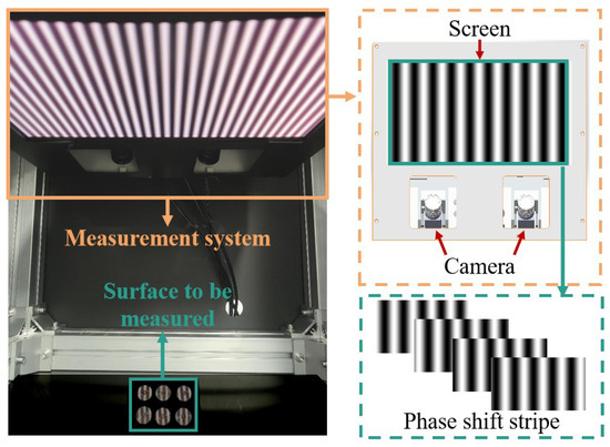 The image of the measurement system is illustrated in Figure 8, consisting of a screen, dual cameras, and their respective lenses. The system’s parameters are detailed in Table 1. The measurement process involves projecting fringes of varying frequencies and periods onto the screen (after gamma correction), while the cameras capture the reflected fringes from the target surface.
