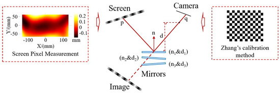 The key components of the PMD system include the camera and the screen. The camera is responsible for determining the direction of the reflected light from the surface under investigation, while the screen determines the direction of the incident light. Consequently, a calibration process is essential before conducting measurements. The calibration procedure and method are outlined in Figure 9, encompassing the calibration of the intrinsic and extrinsic parameters of the cameras, screen pixel calibration, and the calibration of the relative spatial positions of the screen and the camera. For the intrinsic parameters of cameras and the relative spatial relationship, we employed Zhang’s camera calibration method [21]. The screen’s pixel points are meticulously measured by using binocular vision to establish the spatial position of each pixel under the screen’s coordinate system. Finally, a calibration approach based on plane mirrors is utilized to align the camera’s coordinate system with the screen’s coordinate system [22]. Via this method, the camera captures the screen’s mirrored image from three distinct positions of the plane mirror. Each shot generates a set of rotational translation matrices, relating the screen’s mirror coordinate system to the camera’s coordinate system. Leveraging the plane mirror’s normal vector perpendicular to the mirror’s surface, along with the distance between various plane mirrors and the coordinate origin, a least squares matrix is constructed. This matrix facilitates the determination of the screen’s position relative to the camera. After calibration, the system can guarantee time stability. Furthermore, to maintain measurement accuracy, we routinely apply calibration corrections to the system.