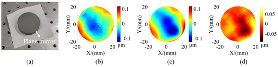 To assess the accuracy of the system, we measured a high-precision circular plane mirror with a 40 mm diameter, as displayed in Figure 10a. This plane mirror was subjected to measurements by using both an interferometer and the measurement system we proposed. The measurement results are presented in Figure 10, with Figure 10b depicting the result of the interferometer and Figure 10c showcasing the result of our system of the plane mirror. From the figure, we can see that the measurement results of our method are close to the measurement results of the interferometer. For a clearer comparison, we calculated the deviation between the measurement results obtained from two measurement methods, and the measurement deviation is shown in Figure 10d. (The measurement result was slightly translated along the Z-direction to ensure symmetrical deviation.) The measured deviation ranged within ±0.092 μm, demonstrating that our system possesses high measurement accuracy. For quantitative analyses, Table 2 provides quantitative evaluation error indices for the plane mirrors measured by using both methods. The table includes peak-to-valley (PV) and root mean square error (RMS) values. Notably, several quantitative indices exhibit proximity to each other.