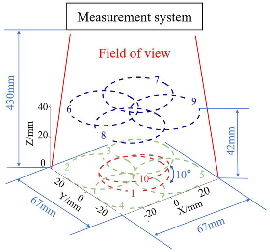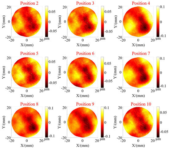 To accomplish batch measurements, it is imperative to ensure that the system maintains stable measurement capabilities across all positions within the field of view. To assess the repeatability of the measurement system and its measurement capabilities at different positions within the field of view, as shown in Figure 11, the plane mirror underwent translation and rotation within a certain spatial range to validate the measurement accuracy at different heights, positions, and rotation angles. A total of 10 measurement experiments were conducted, with a height variation of approximately 42 mm and an angle variation of about 10°. The positions were distributed across the entire field of view at different heights. We calculated the deviation between the results of ten measurements and those of the interferometer. The measurement results for position 1 are presented in Figure 10d, while the remaining results are shown in Figure 12. Firstly, from the deviation figure, it can be observed that the results of the ten measurements exhibit good repeatability. Moreover, we calculated the PV and RMS values of the deviation results, as shown in Table 3. The deviations from the ten measurements have similar PV and RMS values, with calculated standard deviation (SD) values of 0.0314 μm and 0.0049 μm, respectively. Certainly, the small SD value is somewhat related to the inherently small RMS value of the plane mirror itself. Based on these experimental results, it can be demonstrated that the system exhibits high measurement accuracy and stable results for the surface in different poses.