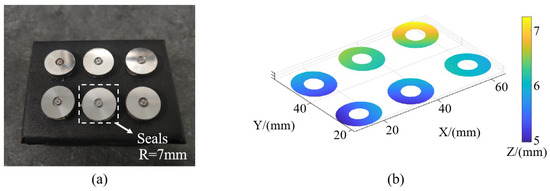 To demonstrate the capability of our method to simultaneously measure multiple specular surfaces, as illustrated in Figure 13a, we projected fringes onto multiple injector-sealing surfaces, capturing images for measurement. By utilizing the surface separation and matching method, along with the surface reconstruction algorithm presented in this paper, we acquired the profiles of multiple surfaces within a single measurement process. The spatial locations of these surfaces are depicted in Figure 13b, highlighting that several surfaces are not perfectly aligned within the same plane, and they are not entirely parallel to one another. This further underscores the advantage of our measurement method over interferometry. Specifically, it eliminates the need for precise surface leveling and positioning, greatly enhancing measurement efficiency.