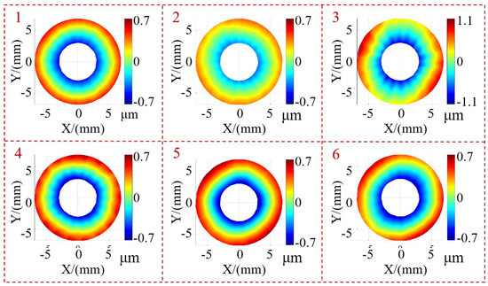 Additionally, as we can individually compute the surface shape for each measured surface, we can easily perform automatic de-tilting and center translation for each face. The de-tilting method involves fitting a plane and rotating its normal vector to align with the Z-axis direction. The center adjustment involves translating the center of the measured surface to the origin of the coordinates. The center can be chosen as either the centroid or geometric center of the surface. The processed results are shown in Figure 14. Then, each surface can be assessed for qualification or further processing as per specific requirements. For instance, among the six measured surfaces, the PV value for surface 3 surpasses the acceptable range (2 μm), indicating a failed product requiring correction. The remaining inspected surfaces meet the criteria for qualification.