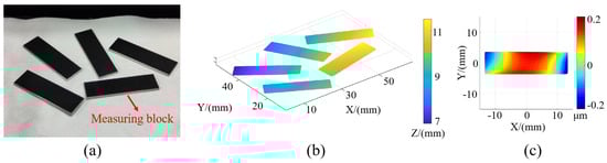 Several gauge block surfaces were subjected to measurement by using the method presented in this study. As depicted in Figure 15a, the blocks were arranged in random positions, ensuring that they could reflect the screen fringes relative to the camera. The relative positions of the blocks and the shapes of the surfaces obtained through the algorithm outlined in this paper are displayed in Figure 15b,c. This experiment serves to illustrate the robustness of the proposed algorithm, which can successfully achieve surface separation, matching, and measurement even when the surfaces are randomly arranged and the surface profiles are varied.