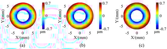 The simulation results are depicted in Figure 7, illustrating the disparity between the simulated reconstruction outcomes and the ideal surface shape. The peak-to-valley (PV) value of this difference indicated in Figure 7a,b indicates that the two measurements are identical when dealing with an ideal plane. As shown in Figure 7c,d, the utilization of plane pre-positioning introduces a slight measurement deviation compared with the accurately positioned points to be measured. However, for a surface undulation of 5 μm, this measurement deviation remains below 5 nm, which equates to an effect on accuracy of roughly one part in a thousand and can be considered negligible during the measurement process. Figure 7e,f simulate the impact of contour positioning deviation by deliberately shifting the fitting plane of the surface to be measured by 5 μm along the vertical direction. It is evident that this 5 μm positioning deviation results in a deviation below 10 nm, indicating a relatively minor influence of plane positioning deviation on the measurement results.