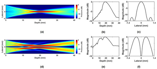 To demonstrate the performance of the proposed method, two kinds of ultrasound field simulations were performed using the Field-II program and the finite element analysis (FEA) based program (OnScale, Atlanta, GA, USA), which are widely used in various ultrasound simulations [43,51,52]. The Field-II program can provide relative acoustic profiles, and the FEA simulation can provide absolute acoustic profiles. In particular, since the FEA simulation is performed based on the properties of materials actually used, it can provide the design parameters necessary for fabricating a prototype transducer. The center frequency of the PIUT was determined to be 5 MHz, which was the highest center frequency for our hardware environment, considering the target size, input sequence composition for ARFI imaging, and the sampling frequency for the data acquisition (DAQ) board (CS121G2, Vitrek Corp., Poway, CA, USA) driven by LabVIEW program (National Instruments Corp., Austin, TX, USA). The aperture size was 8.1 mm × 8.1 mm, the center kerf was 0.1 mm, and the focal depth was determined to be 20 mm, considering the size of the ocular target. In the Field II simulation, the four-segment aperture was designed, and subsequently, the 3D intensity plots were obtained, as shown in Figure 1. Figure 1a is the schematic diagram of the simulated aperture of PIUT. Figure 1b,c show the phases of the applied input signals. For the in-phase mode, the same phase signals are used (Figure 1b), and for the out-of-phase mode, the phase-inverted signals are used (Figure 1c). Figure 1d,e show three-dimensional (3D) normalized intensity at the focal point. In the in-phase mode, a single focal point was generated, while four focal points were produced in the out-of-phase mode. This phenomenon can also be verified in the FEA simulation, as shown in Figure 2. Due to hardware limitations and simulation time, two-dimensional (2D) simulation was performed instead of 3D simulation. However, the accuracy of the 2D simulation is sufficiently high compared to the C-mode pressure fields obtained experimentally. To reduce reflected ultrasound waves returning from the medium boundary, all boundary conditions of the water medium were set to an absorption layer. In the 2D beam profile of the in-phase mode, the single focal point can be observed, as shown in Figure 2a. In the 2D beam profile of the out-of-phase mode, two focal points are shown (Figure 2d). Figure 2b,e show the axial beam plots of the in-phase and out-of-phase modes, and it was verified that the −3 dB DOF of the out-of-phase mode was increased by 60%. In the case of lateral beam plot, the out-of-phase mode increases the −3 dB lateral beamwidth by 159% compared to the in-phase mode. Note that the mesh size for all FEA simulations was determined using 25 elements per wavelength for water, which has the smallest wavelength among the materials in the model, taking into account computational time and time resolution.