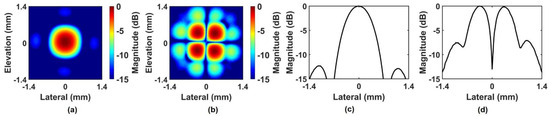 A backing layer was cast on the part, and sub-dicing was performed to separate elements. After wiring, it was combined with housing, and the electrode was formed on the aperture using Chrome/Gold (500 Å/2000 Å). Two diagonally positioned elements are connected to each other. Figure 4a shows the photograph of the prototype PIUT, and the four-segment aperture can be seen clearly. Figure 4b shows the pulse-echo experimental result. The center frequency was 5.09 MHz, and the −6 dB fractional bandwidth was 66.41%. Figure 5 shows the measured pressure fields in the constant depth mode (C-mode) and the lateral beam plots. Figure 5a,b show the C-mode pressure fields for the in-phase mode and the out-of-phase mode, respectively. Figure 5c,d show the lateral beam plots for the in-phase mode and the out-of-phase mode, respectively, based on one-way propagation. The −3 dB lateral beamwidths were 0.71 mm and 1.2 mm in the in-phase and the out-of-phase modes, respectively. That is, the −3 dB lateral beamwidth of the out-of-phase mode was improved by 69% when the center valley was included. In the FEA simulation, the −3 dB lateral beamwidths of the in-phase mode (Figure 2c) and the out-of-phase mode (Figure 2f) were 0.62 mm and 1.64 mm, respectively. In the C-mode experiments, the −3 dB lateral beamwidths of the in-phase mode (Figure 5c) and the out-of-phase mode (Figure 5d) were 0.71 mm and 1.2 mm, respectively. There are some differences between FEA simulation and experiment; however, the errors are not significant. Additionally, these errors can occur due to limitations in 2D simulation and manufacturing errors in the prototype transducer.