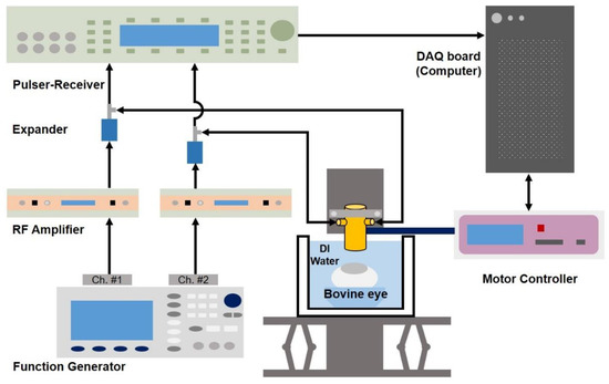 Figure 6 shows a schematic diagram of the experimental setup for B-mode and ARFI imaging of a bovine eye.
