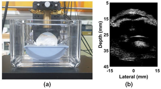Photograph of (a) bovine eye target, and (b) obtained B–mode image of (a).