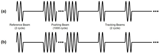 Schematic diagram of the input sequence composed of reference beam, pushing beam, and tracking beams for (a) in–phase mode and (b) out–of–phase mode. Note that the phases of the pushing beams in the two modes are different.