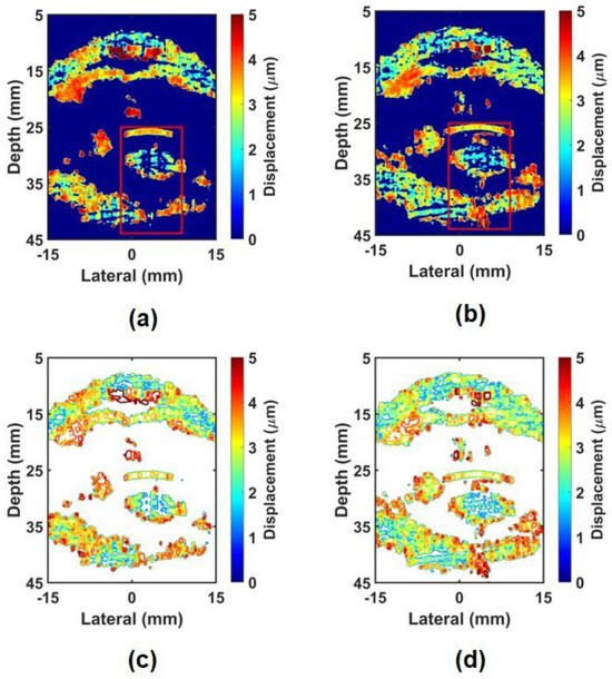 In this paper, SNR was calculated instead of CNR (Contrast to Noise Ratio) to compare the performance of the proposed technique. Due to the characteristics of ocular structures, it is difficult to select an appropriate background region to evaluate CNR [28]. In other words, if the transparent area of the vitreous body is selected as the background area, the average displacement and displacement standard deviation of the background area have values close to zero because they are rich in moisture and have almost no scatterers. In this case, the CNR equation converges to the SNR equation, and thus, the SNR was employed instead of CNR in this study [54,55,56,57,58,59].