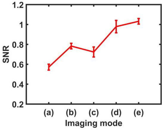 Comparing CARFI images as shown in Figure 10, the compound image in the out-of-phase mode shows an improved mean SNR value than the in-phase mode. CARFI images outperformed non-compound ARFI images in all modes. As shown in Figure 10c, for the CARFI image in the mixed mode (in-phase + out-of-phase), the mean SNR value was 1.032, showing the highest SNR among all ARFI images. This is because we can obtain both the advantage of the in-phase mode, which provides high displacement in the middle field region and the advantage of the out-of-phase mode, which provides high displacement in the far-field region.