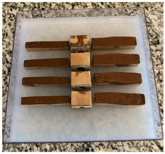 Layout of epoxy-based features within the supporting tray prior to complete filling with an agarose gel—the tray is partially filled with gel, as shown, to elevate the rectangular blocks to the mid-height of the tray. The central square blocks extend from the tray bottom to ∼4.0 cm of height above the tray floor. Note the holes drilled through the central square blocks.