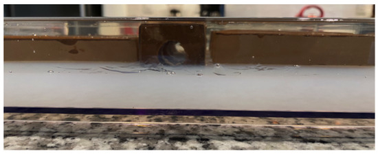 Edge view of phantom, immediately after pouring sufficient molten agarose to fill the upper half of the phantom, fill holes, and fully cover all low-conductivity features; the rectangular features are shown resting on the lower (white) portion of previously poured and cured agarose.