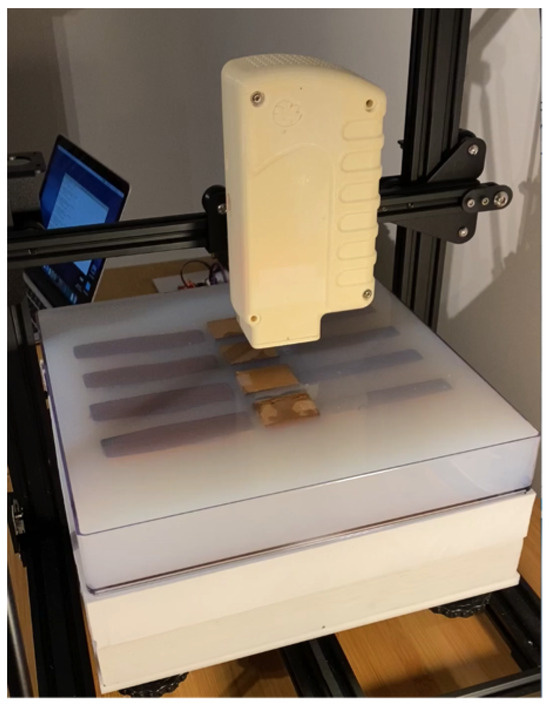 A discarded Creality Ender 3D printer was acquired and repurposed for the single-coil scanning measurements needed for image reconstruction. The print head was removed and modified to allow for mounting of the enclosure and its attached sensing coil. A custom stepper motor controller was built, and associated software was written to control the movement of each stepper motor mounted on the printer while simultaneously measuring inductive loss [13] at ∼8.85 MHz.