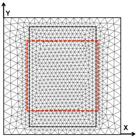 Finite element mesh extruded to form the six layers of prismatic elements. The inner black, bolded line is placed for mesh refinement over the region where low-conductivity features are located, while the dashed red line shows the sampling region. Rectangular blocks run parallel to the Y-axis.
