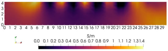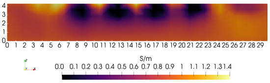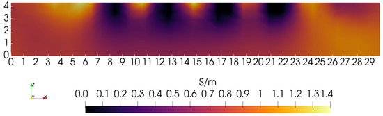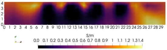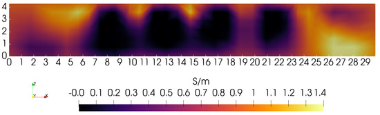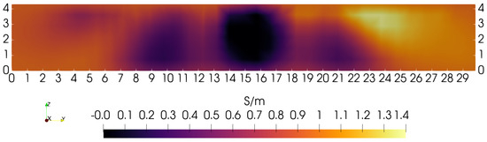During the course of image reconstruction, the average electrical conductivity is computed as 0.94 S/m (via Equation (12) of [4]). Viewing the bottom of the image in Figure 5, conductivity is very close to this value. Even though the penalty is applied equally along the Z-axis, reconstruction suggests that the penalty is too high near , preventing any significant departure from the average near the lower boundary. The features that should be visible in the lowest portions of the image have collapsed to the average value. Apparently, the uniformly applied penalty is too large for these features to appear beneath ∼2.0 cm, though instrumentation noise likely also contributes to a lack of sensitivity to structure at depths exceeding ∼2 cm [4].