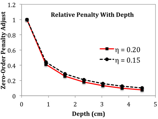 To improve sensitivity to features within the deeper layers of the phantom, the zero-order penalty is reduced with depth. Equation (36) is plotted for two values of the parameter , to give a sense for its effect.