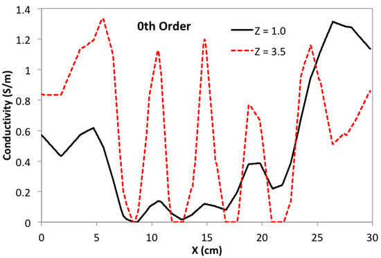 Line plot of conductivity at constant Y = 15 and Z = 1 cm or 3.5 cm. Note prominent peaks at X = 10.5, 15.0, and 19.5 cm at Z = 3.5 cm corresponding to gaps between features; near the bottom, at Z = 1.0 cm, the same gaps are only modestly noticeable.