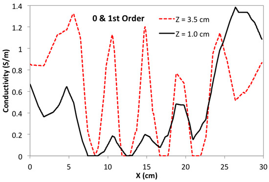 Line plot of conductivity at constant Y = 15 and Z = 1 cm or 3.5 cm, though now both penalty terms are reduced with depth into the phantom. Peaks located at X = 10.5, 15.0, and 19.5 cm for Z = 1.0 cm are somewhat more prominent than before.