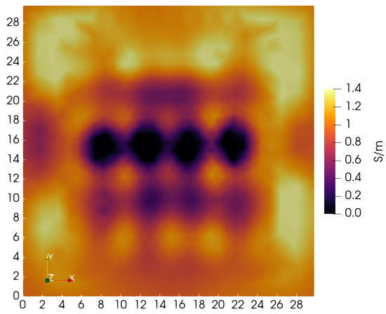 A mid-plane horizontal slice taken at Z = 2.15 cm is shown in Figure 14. This image also shows the failure of reconstruction to reveal the lateral rectangular blocks over their full length. Though the four square blocks fully appear and line up along the X-axis as they should, the conductivity is assigned a near-zero value, smaller than the expected 0.10 S/m. The depressed value may be a result of the sudden jump in relative permittivity, a feature not captured by the model Equation (1)—agarose gel relative permittivity is ∼72.