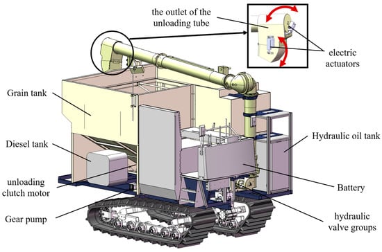 Based on the exclusive version of the combine harvester chassis of the WORLD Company, an unoccupied tracked grain vehicle with a 4.5 m3 loading capacity was specifically designed in Figure 1. To maximize space utilization, the grain tank featured a V-shaped design with a wider upper section and a narrower lower section. This design facilitated the installation of hydraulic components such as the battery, diesel tanks, unloading clutch motor, hydraulic valve groups, hydraulic filters, gear pumps, and other hydraulic parts while optimizing the grain tank’s volume. The size of the grain tank determined the design of an elongated and thickened horizontal grain-stirring auger, which was regulated by a hydraulic motor to adjust the stirring speed of the auger. Precise control over the unloading location was achieved through the use of two electric actuators governing the outlet of the unloading tube rotation with two degrees of freedom.