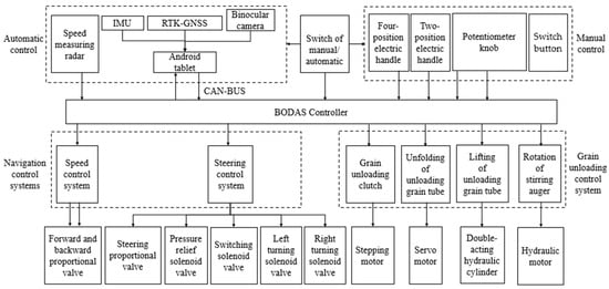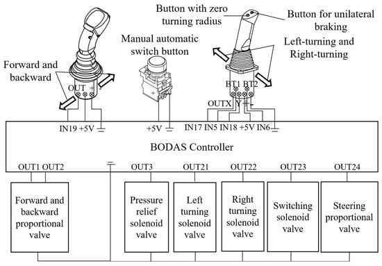 The electrical control system for the unoccupied tracker grain vehicle was developed using an electric control lever (analog voltage operating lever), a three-position and four-way proportional valve group, and a BODAS controller (illustrated in Figure 2), in which the bottom controller (Rexroth BODAS controller RC28-14, Bosch Rexroth, Shanghai, China) received the electrical signals of the electric control lever, the switch button, and knob or the CAN signal from the Android tablet to regulate the movement and unloading systems of the tracked grain vehicle. By adjusting the opening and closing of the hydraulic valve groups in the chassis, the vehicle achieved straight-line variable speed and steering mode switching by adjusting the opening of the unloading hydraulic valve group. The elevation control of the unloading tube and the rotation control of the grain unloading stirring auger were accomplished by adjusting the aperture of the hydraulic valve assembly. Moreover, the unfolding of the unloading tube was achieved through simultaneous control of the stepping motor and the servo motor.