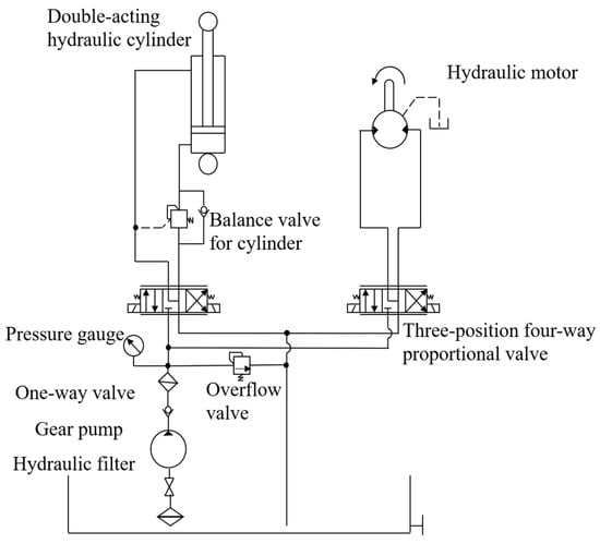 The engine speed was transferred to the gear pump via a belt during the grain unloading process; the hydraulic system is illustrated in Figure 4. It comprised a pulley for the gear pump with a diameter of 170 mm and a pulley for the output shaft of the engine with a diameter of 210 mm; the transmission ratio between these pulleys was 17:21. Consequently, when the engine reached its maximum speed of 2500 rpm, the gear pump rotated at 3088 rpm. To fulfill the requirements, the Rexroth AZPG-22-40OLDC gear pump (Bosch Rexroth, Shanghai, China) was selected, featuring a displacement of 40 mL/r and a maximum flow rate of 123 L/min. Two sets of proportional valves received an analog current (4–20 mA) to regulate the double-acting hydraulic cylinder and hydraulic motors, respectively, and the maximum flow rates of the valves were 10 L/min and 65 L/min. Meanwhile, the double-acting hydraulic cylinder, responsible for controlling the lifting and lowering of the grain unloading tube, managed a maximum flow rate of 10 L/min and had a 200 mm stroke. In order to ensure that the rotational speed of 800 rpm for the grain unloading stirring auger, the hydraulic motor necessitated a minimum flow rate of 65 L/min, so the chosen hydraulic motor, belonging to the BMSY series from Zhenjiang Dali Hydraulic Motor Company, had a displacement of 80.6 mL/r.