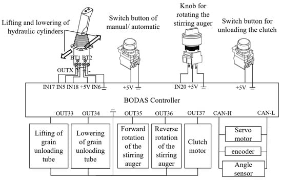 The integrated device that combined manual and automatic options for the grain unloading system encompassed the grain unloading clutch button, grain unloading clutch motor, electric control lever, potentiometer knob, double-acting hydraulic cylinder, two sets of three-position four-way proportional valves, hydraulic motor, and grain unloading motor; the electronic control structure is displayed in Figure 5. The grain unloading function included unfolding and lifting the grain unloading tube, rotating the grain unloading stirring auger, and engaging the grain unloading clutch. The unfolding of the grain unloading tube was accomplished by controlling a servo motor (Keiou Motor 90WSCB-001, Shandong Kaiou Motor Tech Co., Zibo, China), the lifting of the grain unloading tube and the rotation of the grain unloading stirring auger were driven by adjusting the opening of the two sets of three-position four-way proportional valves to extend or retract the hydraulic cylinder and rotate the hydraulic motor, respectively, and the grain unloading clutch function was executed by a stepper motor that tightened or loosened the transmission belt, thereby activating the articulated tensioning wheel to engage or disengage the clutch. The servo motor’s encoder provided feedback on the motor’s rotation angle, while an angle sensor installed on the grain unloading tube offered feedback on the extension and retraction of the double-acting hydraulic cylinder, enabling closed-loop control.