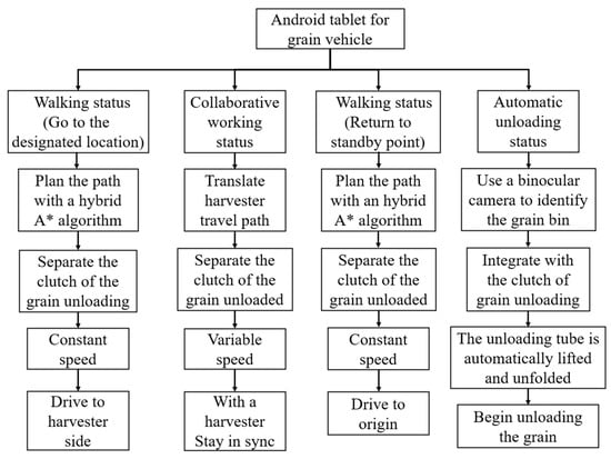 According to the operational requirements of the collaborative operation between the tracked grain vehicle and the combine harvester, the control logic of the grain vehicle is shown in Figure 6. When the loading rate of the combine harvester grain bin reached 90%, it transmitted a grain unloading co-operative signal and location information to the Android tablet of the grain vehicle via a 4G transmitting module. Upon receiving the signal, the grain vehicle began moving and sent the positioning signal to the combine harvester when it reached the designated location. Subsequently, the combine harvester expanded the grain unloading tube and initiated unloading while the grain vehicle maintained a consistent speed, traveling alongside. When the combine harvester’s grain tank was emptied, it sent a signal indicating the completion of unloading to the grain vehicle, and the vehicle started to return to the standby point. When the vehicle arrived at the standby point, it expanded the grain unloading tube, looked for the unloading point through the binocular camera, and then the unloading stirring auger rotated to initiate the unloading process.