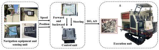 The navigation control system of the tracked grain vehicle was primarily composed of navigation devices, sensor units, a control unit, and an execution unit, as depicted in Figure 7. The sensor units comprised a GNSS antenna, a BeiDou combined navigation module (MS6111), DTU (MD649), and speed measuring radar (MICRO-TRAK) (Beijing BDStar Navigation Co. Ltd. Beijing, China). The control unit employed the signal input pins of the Android tablet and the Bosch Rexroth BODAS hydraulic controller (Bosch Rexroth, Shanghai, China) to gather information from the sensing devices and controlled the walking module and automatic grain unloading module through the signal output pin. The executive unit consisted of the straight-line travelling system and steering system, which was composed of the chassis walking hydraulic valve group.