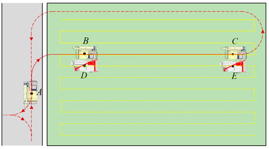 As illustrated in Figure 8, the tracked combined harvester adopted a zigzag operation path. At point D, it was anticipated that the grain tank would be filled (>90%). Point B, defined as the unloading point, was obtained by moving the D-point vertically towards the already harvested area by the operating width of the combine harvester. The pose information of unloading point B was transmitted to the grain vehicle through the 4G transmitting module. The unharvested field was used as an obstacle, and the field environment model was combined with the hybrid A* algorithm to plan a path for the grain vehicle from point A to point B, which represented the route from the field edge to the starting position of coordinated grain unloading. After the grain vehicle reached point B according to the generated path, the two vehicles initiated coordinated grain unloading. The grain vehicle moved in sync with the combine harvester along the operating path that the harvester had already travelled until point C, where the coordinated unloading was completed. Subsequently, the grain vehicle employed a hybrid A* algorithm to plan the return path and returned to point A.