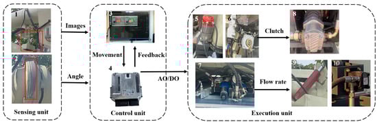 As shown in Figure 12, the automatic grain unloading control system for the tracked grain vehicle comprised three main components: the sensing unit, the control unit, and the execution unit. The sensing unit included a ZED2 binocular camera (Stereolab, Beijing, China), an integrated encoder, and a non-contact angle sensor; the binocular camera was installed in the outlet of the unloading tube to capture downward-facing images. The integrated encoder of the servo motor that controlled the rotation of the unloading tube obtained the unfolding angle of the unloading tube , while the angle sensor installed under the unloading hydraulic cylinder obtained the lifting angle of the unloading tube . Leveraging the geometric relationships in three-dimensional space, the actual landing point of the grain can be projected. The control unit consisted of the Bosch Rexroth BODAS hydraulic controller and an Android tablet, while the execution unit comprised the unloading servo motor, unloading clutch motor, unloading hydraulic valve group, gear pump, double-acting hydraulic cylinder, and hydraulic motor.