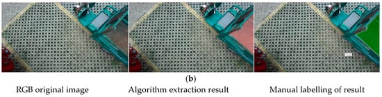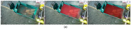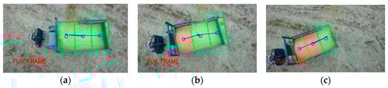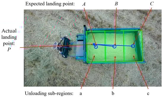 After the coordinated unloading of the combine harvester and grain vehicle, it was necessary to return to the edge of the field and unload the grain from the grain tank onto the wheeled transport vehicle on the agricultural road. In this experiment, an agricultural tricycle was used to simulate the transport vehicle. The dimensions of the agricultural tricycle’s grain tank were measured as 45 cm × 85 cm × 140 cm, and the grain tank was evenly divided into three unloading sub-regions: a, b, and c. Rice was used as the grain for unloading, and the automatic unloading experiment was carried out for an empty grain tank and a partially piled grain. The relative pixel deviation between the actual landing point and the expected landing point , , of the three unloading sub-regions was calculated to evaluate the accuracy of the unloading positioning regulation system. The deviation results of the automatic grain unloading control experiment are shown in Table 3. The regulatory effects of the automatic grain unloading experiment are illustrated in Figure 23.
