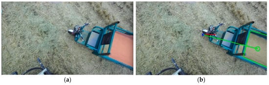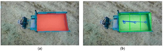 Fitted rectangle of the complete unloading area: (a) Semantic segmentation effect; (b) Fitted rectangle effect.