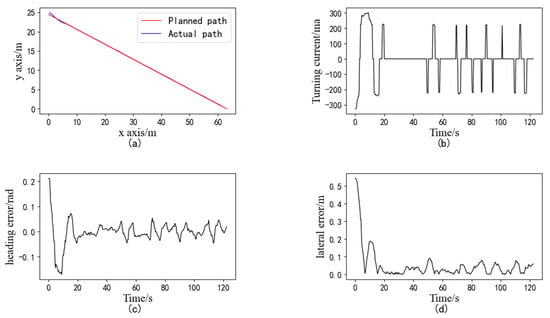 Experiment results of the straight-line path tracking: (a) Trajectory of path tracking; (b) current of the steering proportional valve; (c) heading error; (d) lateral error.