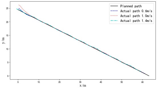 The statistical results of all straight-line path-tracking experiments are provided in Table 2. Figure 21 illustrates a comparison of the actual tracking path for a single straight tracking experiment at low, medium, and high speeds. The deviations of the experiments are shown in Figure 22; it is evident that both the average lateral deviation and average heading deviation increased with higher driving speeds. The experiment results demonstrate that the average lateral absolute deviation was 3.14 cm and the standard deviation was 3.47 cm at the low speed of 0.6 m/s; the average lateral absolute deviation was 4.63 cm and the standard deviation was 3.93 cm at the medium speed of 1.0 m/s; and the average lateral absolute deviation was 6.46 cm and the standard deviation was 4.58 cm at the high speed of 1.4 m/s. The accuracy of straight-line path tracking met the requirements for unoccupied driving of the tracked grain vehicle.