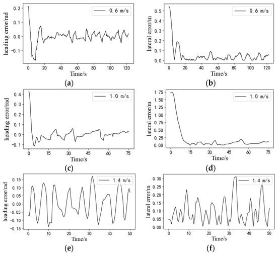 Deviations of straight-line path tracking at different speeds. (a) heading error at the speed of 0.6 m/s; (b) lateral error at the speed of 0.6 m/s; (c) heading error at the speed of 1.0 m/s; (d) lateral error at the speed of 1.0 m/s; (e) heading error at the speed of 1.4 m/s; (f) lateral error at the speed of 1.4 m/s.
