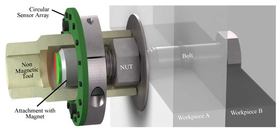 Tool with circular magnetic sensor array to fasten a bolted joint. A magnetic encoder is placed at the thread of the bolt. This design was first presented in a patent application [7].